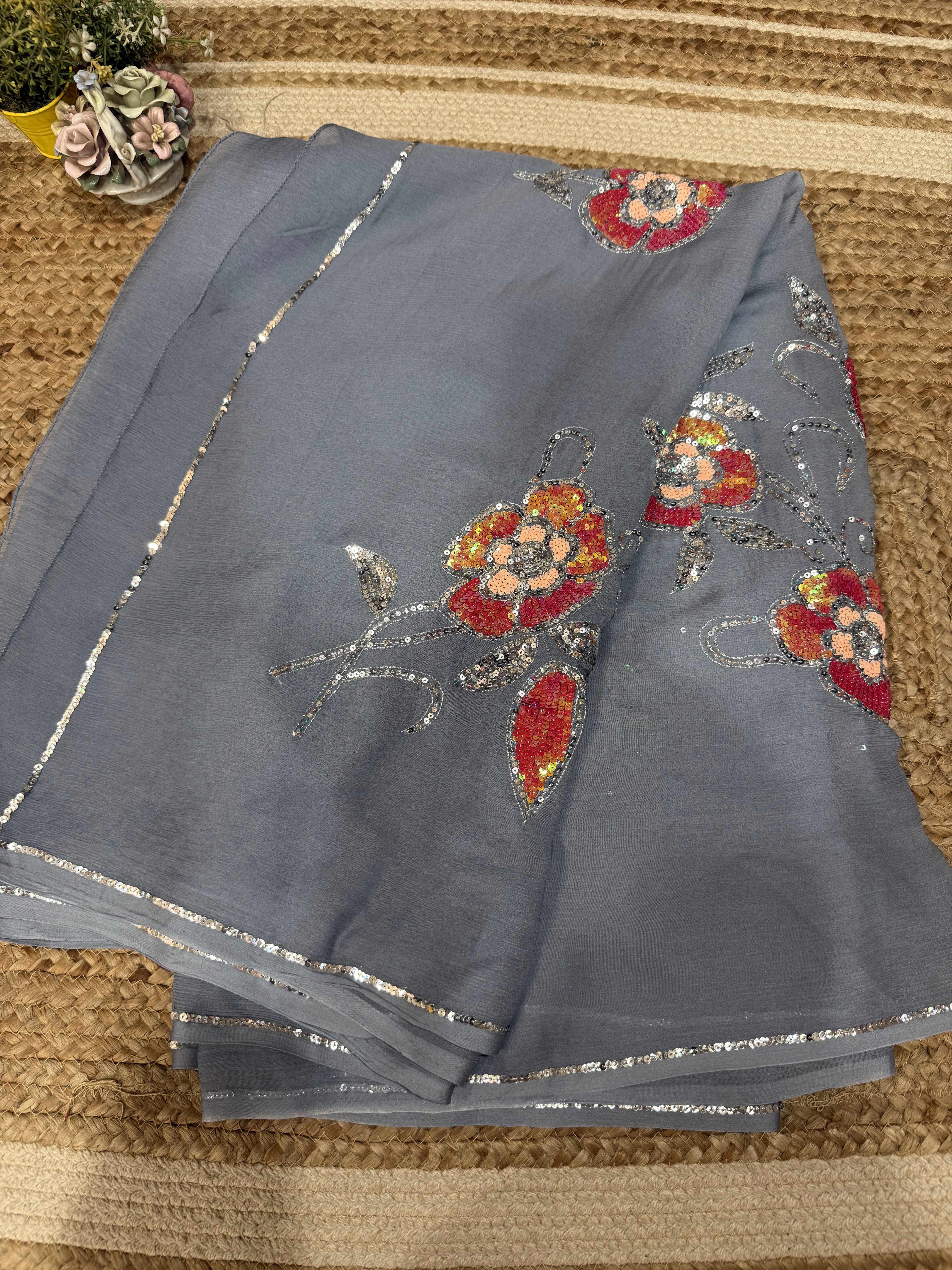 A sophisticated grey saree that exudes understated elegance. Crafted in a light, fluid fabric, it is adorned with intricate handwork featuring vibrant floral motifs in sequins, adding a subtle yet striking contrast. Finished with a delicate shimmer along the border, it’s perfect for effortless, refined styling.