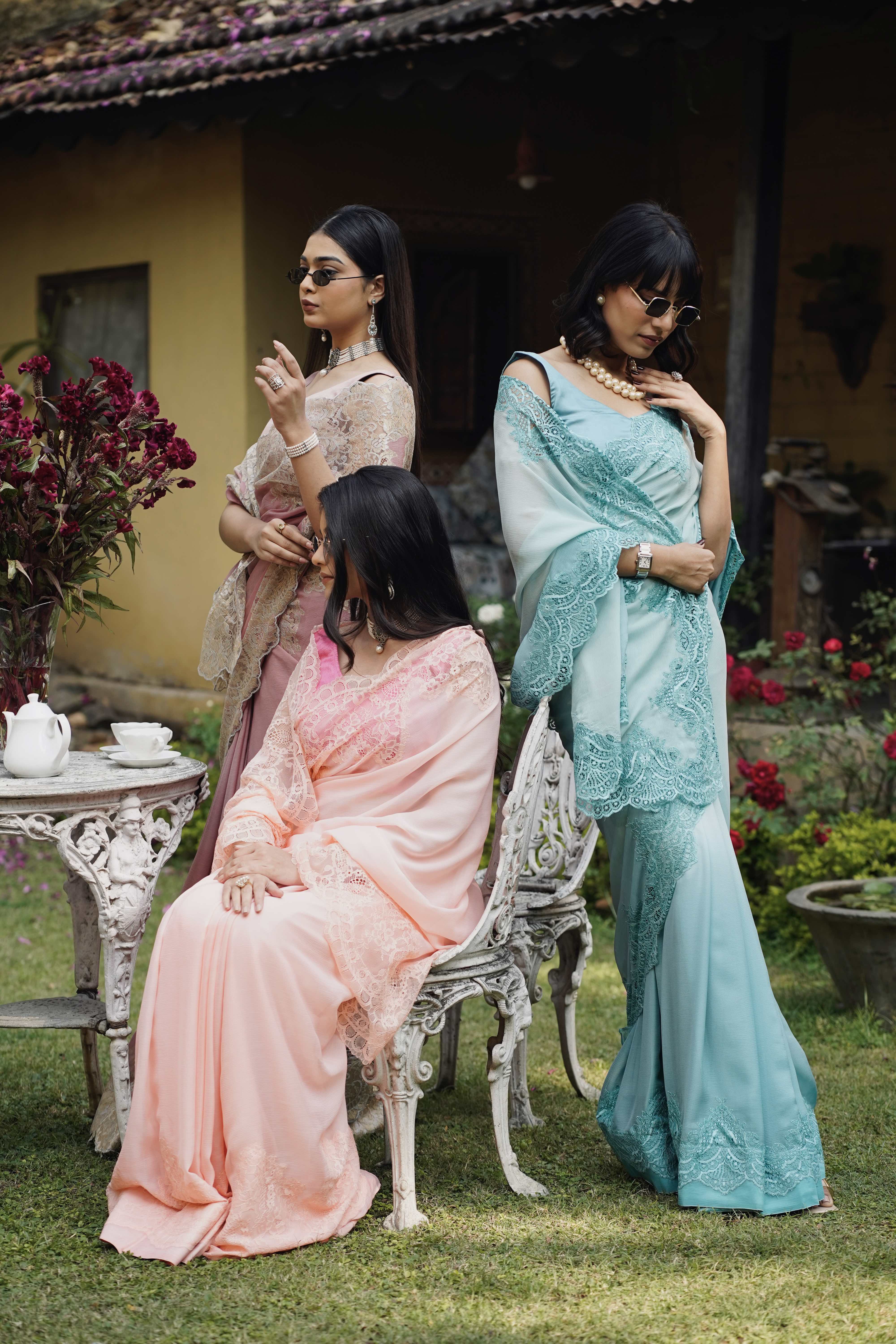 A soft peach chiffon saree adorned with matching peach Chantilly lace that flows like a dream. Its airy elegance carries a touch of old-world charm, balanced beautifully with modern sophistication. Delicate, ethereal, and effortlessly graceful—this peach masterpiece drapes with a quiet luxury that feels timeless.